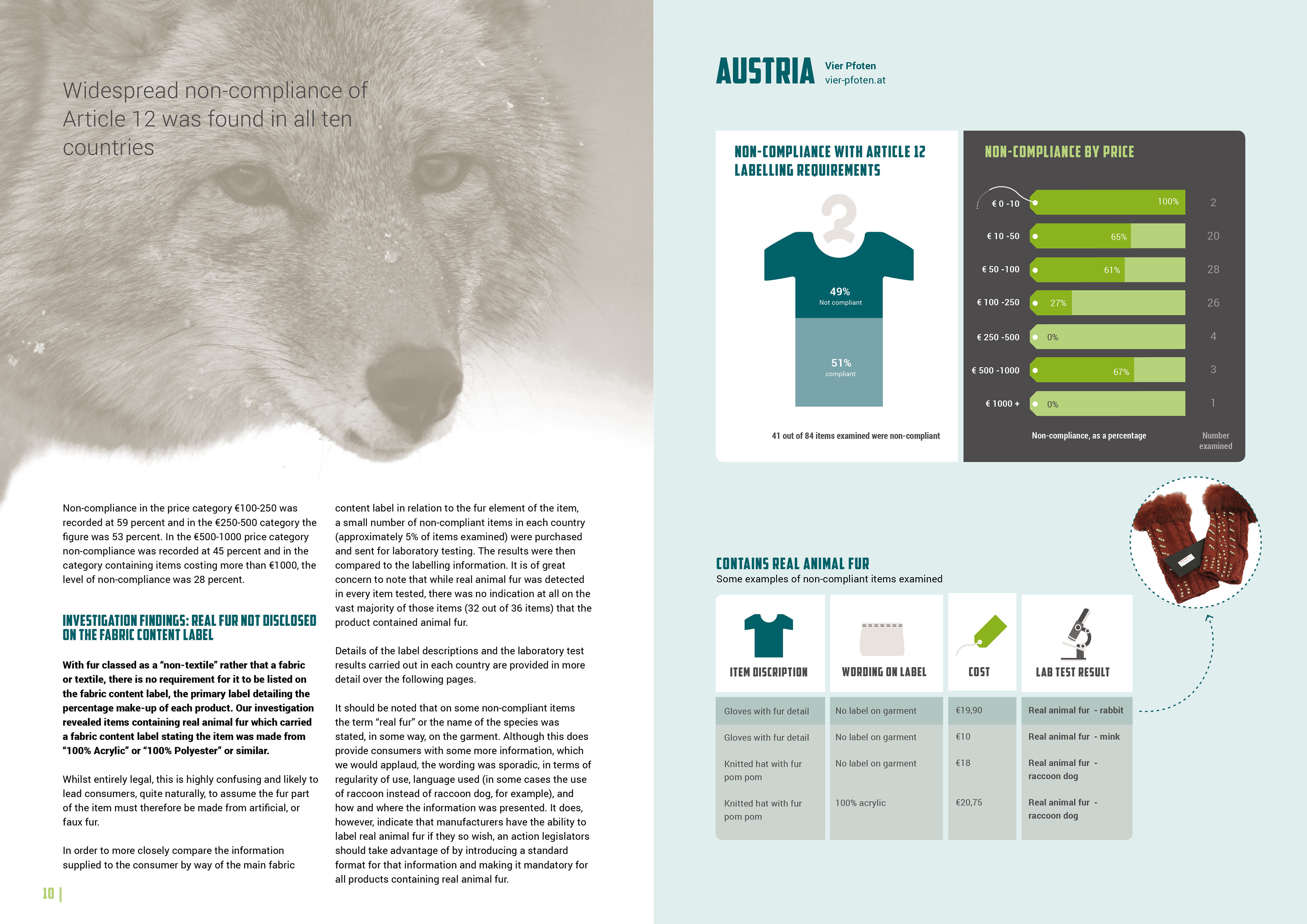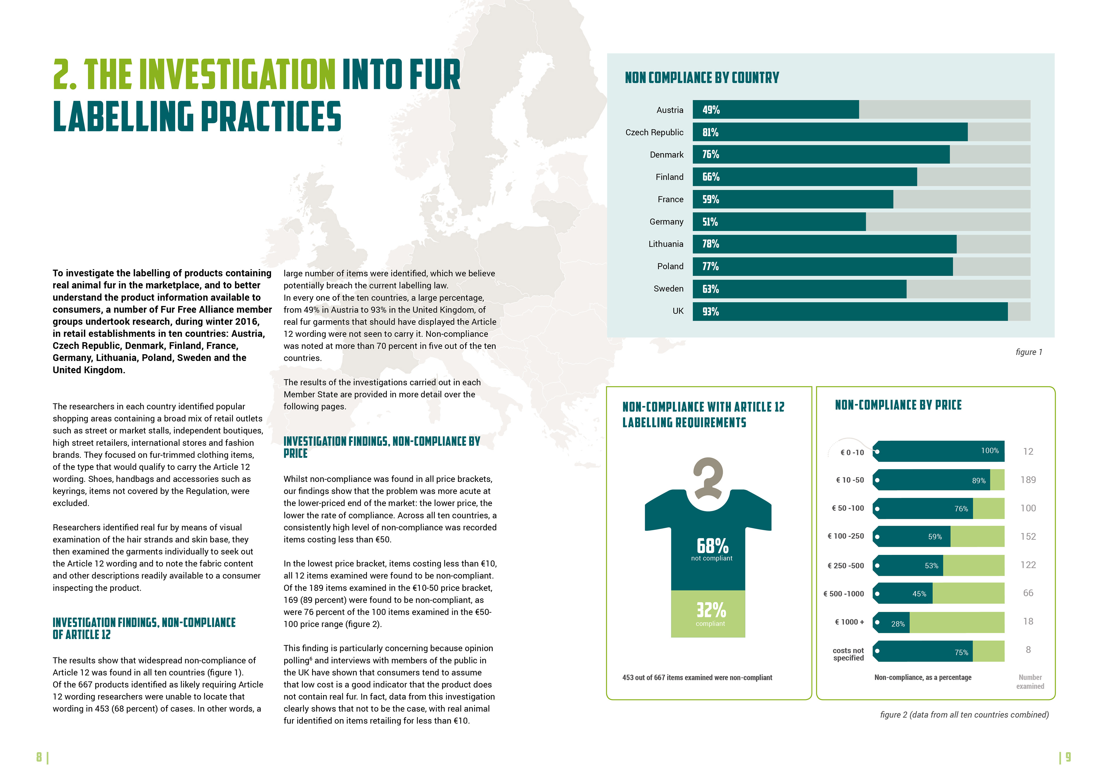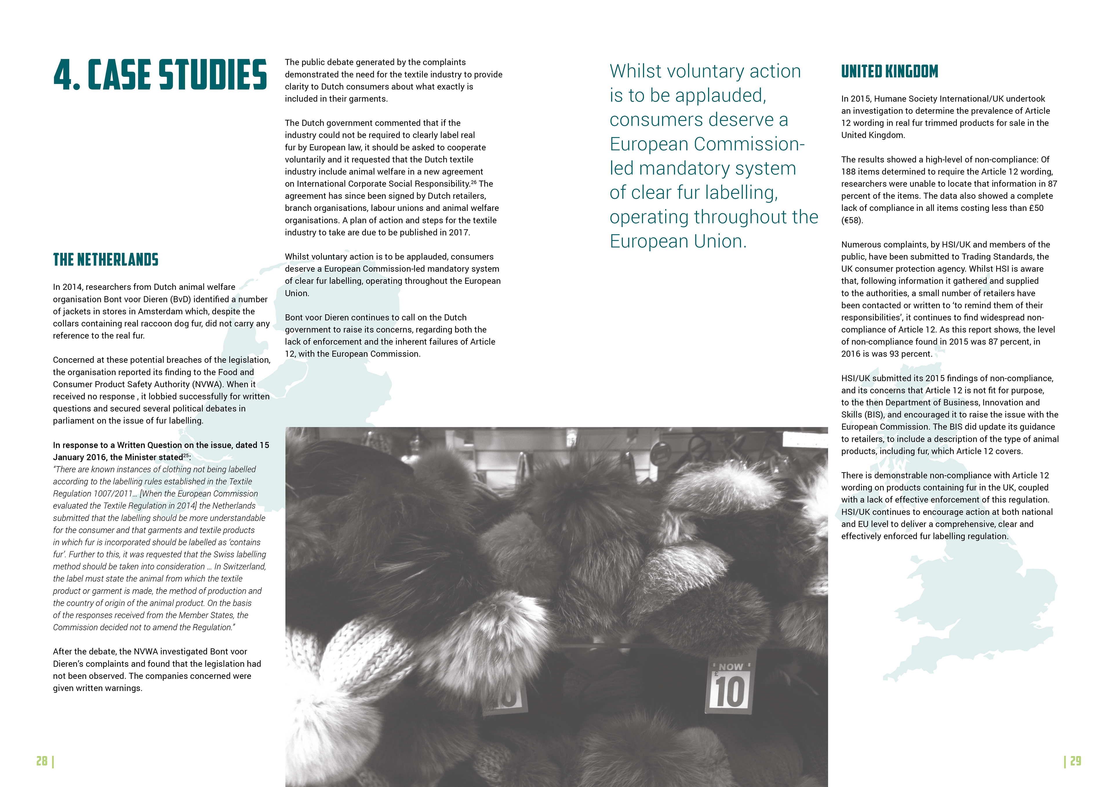Vormgeving van het rapport van de Fur Free Alliance over de misleidende teksten op kleding en assesoires die van bont gemaakt zijn.