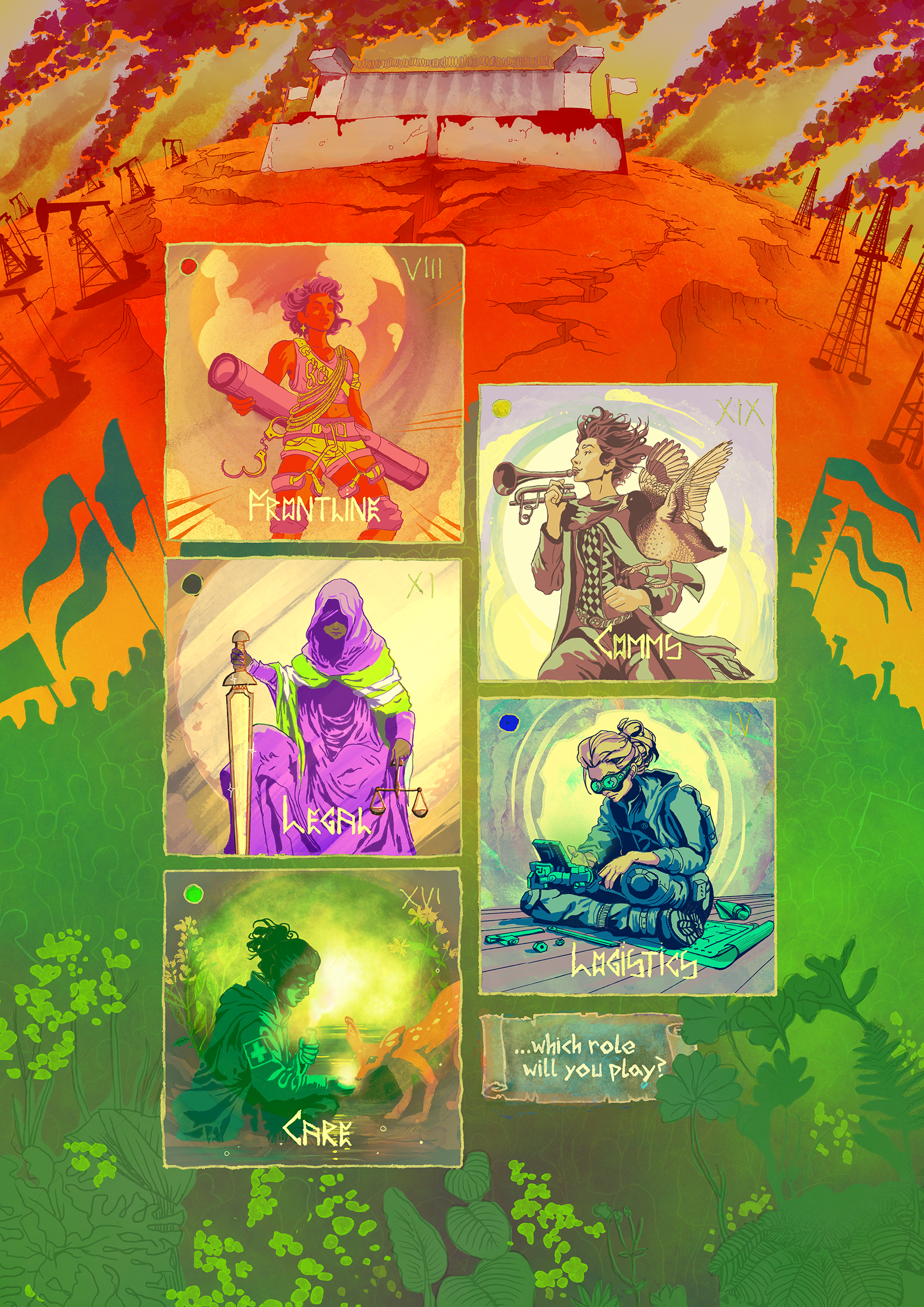 Terwijl het leven voor veel mensen duurder wordt en de lonen niet voldoende stijgen, krijgen de fossiele bedrijven royale steun van de overheid. Hoeveel steun krijgen deze fossiele bedrijven, en in welke vorm(en)? En wat kunnen we doen om dit te veranderen en een rechtvaardige overgang naar een fossielvrije toekomst op gang te brengen? Vormgeving achterzijde gevouwen flyer/ poster Illustraties door Michelle Tyliki